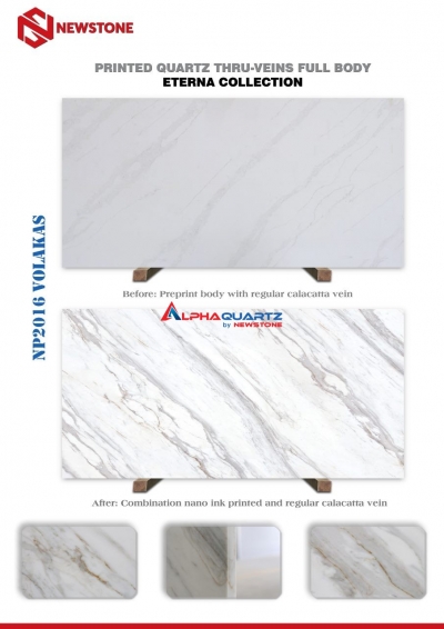 Full body printed quartz brings uniformity between the surface and the structure inside the stone slab. Printed quartz has all the outstanding characteristics of quartz such as heat resistance, good strength, scratch resistance, abrasion resistance while also possessing the beauty of natural stone, calacatta designs, marble, granite.